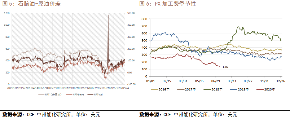 以cfr日本石脑油为准,石脑油(cfr日本)本周基本呈上涨态势,至周五为404美元/吨。美原油08合约周四周五大幅回调,周内最低至38.54美元,周五晚大幅回升,周度涨幅仅0.74%,收盘重回40美元以上。布油09合约走势基本和美油一致,周中最低回调至41.32美元,周度涨幅仅为0.91%,收盘回升至43美元以上。石脑油-Brent原油价差本周整体较上周大幅走阔,最多走阔至93美元附近,至周五收窄至86美元;石脑油-WTI原油价差与NPT-Brent价差变动一致,周内最多走阔至113美元附近,至周五收窄至106美元。PX(cfr中国)价格周一大幅山长至548元后周内震荡下跌,至周五跌至540美元/吨。 自2020年7月1日,因韩国现代小幅扩能18万吨,亚洲PX总产能调整至6028万吨。国内PX产能维持2503万吨。PX-NPT价差本周再度突破新低,最低为周五的136美元,为历史最低水平。
