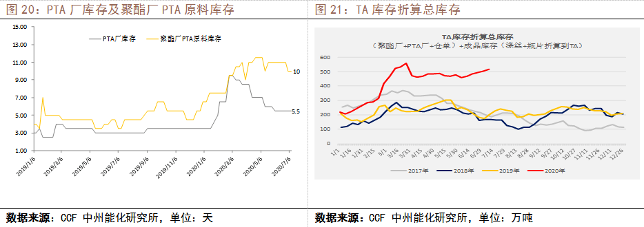 PTA厂库存连续六周维稳在5.5天。聚酯厂PTA原料库存连续两周稳定在10天。PTA折算社会总库存实际上核算的是PTA库存和聚酯产品库存的合计,环比上周大幅回升——本周PTA原料库存和聚酯成品库存均累库,较多的量体现在聚酯成品库存上。绝对库存仍为近4年的同期水平的最高位。
