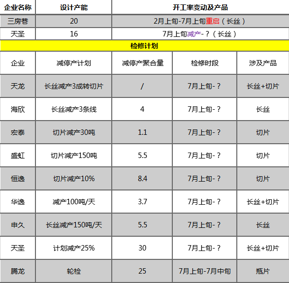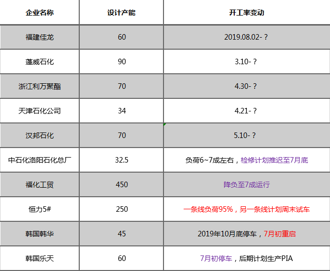 PTA国内装置——因恒力5期250万吨PTA装置于6月底投产,PTA产能基数调整至5483万吨。扬子石化60万吨装置、逸盛海南200万吨装置检修计划推迟;中石化洛阳石化总厂32.5万吨装置检修计划推迟至7月底;恒力5# 250万吨新装置一条线负荷95%,另一条线计划周末试车。