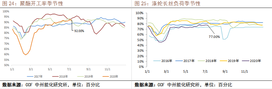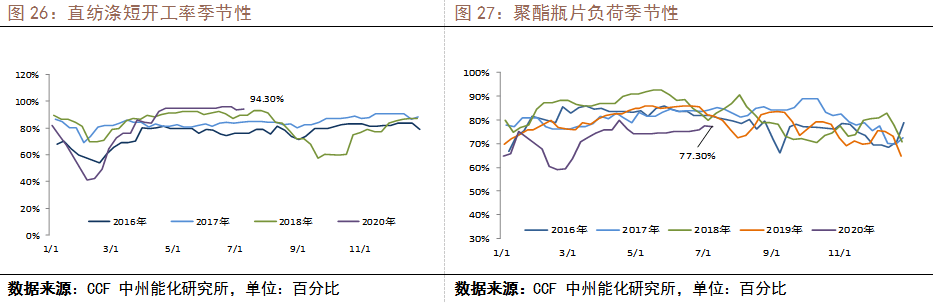 聚酯本周虽有大量检修计划公布,但总体负荷仍维持上周水平,至周五为92%,为仅低于2018年水平的次低水平。其中,涤纶长丝开工率较上期小幅下降0.5%至77%;聚酯瓶片负荷小幅下降0.3%至77.30%;直纺涤短开工率小幅回升0.7%的94.30%。 直纺涤短开工率仍为历史同期最高水平;涤纶长丝开工率仍为仅高于16年同期的次低水平;聚酯瓶片开工率仍为历年同期最低水平。