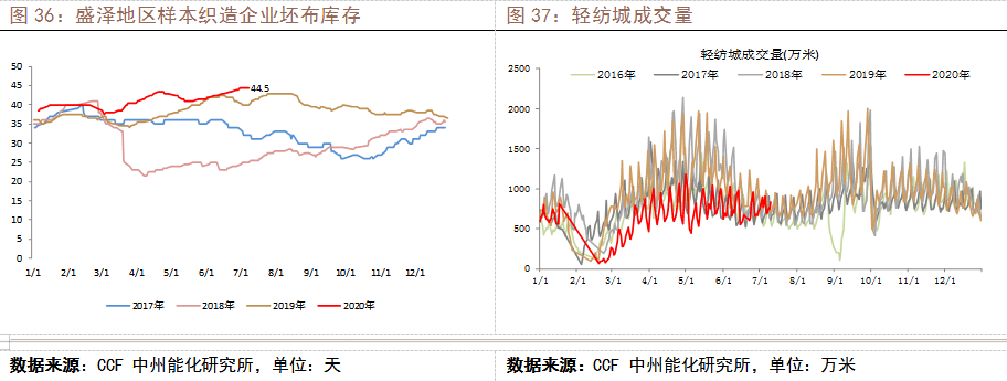 盛泽地区样本织造企业坯布库存天数5.25起又再度回升,目前44.5天,为历年同期最高水平,今年的淡季在疫情的影响下较往年来得更早,5月底开始连续累库(往年至少要到6月下至七月上坯布库存才开始累库)。淡季背景下,坯布库存仍有继续累库的预期。 轻纺城成交量6月下旬开始和往年同期相差不大,主要由于终端在这个时间段都处于淡季,成交清淡。下半年金九银十的旺季需求或会在8月中旬开始有所体现,也有延后或旺季不旺的风险,关注疫情发展情况。