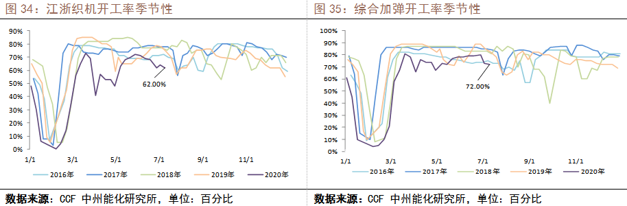 本周江浙织机、加弹开工整体小幅下降。截至目前,织机、加弹开工率分别在62%、72%。江浙织机开工率小幅下降2%,仍为历年同期最低水平。综合加弹开工率小幅下滑1%,为历年同期最低水平。涤纶长丝大幅亏本促销,终端虽然采购有所跟进,但力度相对有限,仅在周三成交略放量,产销率达到110%-120%。订单有限的情况下,生产的持续性也难以维持。