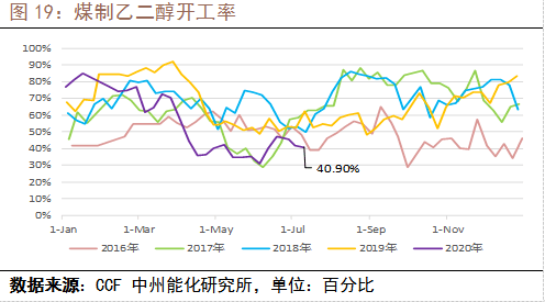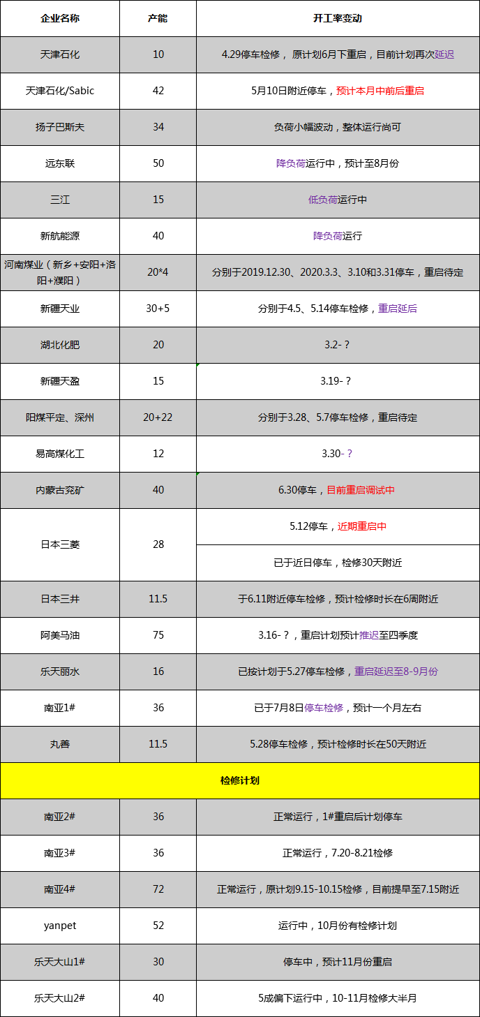 新装置投产情况:新疆天业60万吨煤制乙二醇装置中的第一个20万吨及中科炼化40万吨装置已在试车阶段,预计7-8月供应市场。