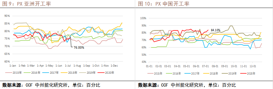 PX亚洲开工率本周小幅回升,环比上期回升1.38%至76%;PX中国开工率环比上周大幅回升2.9%至84.10%。