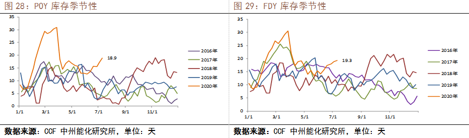 下游聚酯产品库存变动情况:涤纶长丝全面累库:POY大幅累库1.8天至18.9天,FDY小幅累库0.4天至19.3天,DTY库存大幅累库1.8天至29.6天。涤纶短纤连续五周累库,目前库存6天,环比上期累幅1.5天。聚酯瓶片库存维持上周库存水平的20天偏上。 涤纶短纤库存回升至历年同期均衡偏上水平,低库存优势不再;涤纶长丝及聚酯瓶片库存均维持历年同期的最高水平。