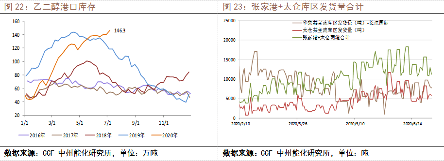 乙烯东北亚价格周内跌至800美元/吨后维稳。乙二醇港口库存7月6最新库存显示环比上期大幅累库。截至7月6日,华东主港地区MEG港口库存约146.3万吨,环比上期上涨5.9万吨。据船报显示,7月6日至7月12日,四大港口预计到货总量为32.6万吨, 仍为极多水平。张家港及太仓两港主流库区发货近日发货中性,平均合计日均基本在12000吨/天左右。 港口库容问题或会导致显性库存增加缓慢,显性库存累库放缓。