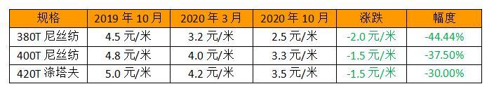 原本受到疫情影响,今年尼丝纺的销量可谓是跌入谷底,十月前一直处于滞销状态。其实尼丝纺早在前两年就开始走下坡路,做尼丝纺的企业都深刻感受到了订单量的暴跌。甚至一些尼丝纺厂家对其失望至极,已经开始转做其他品种。尼丝纺的销量之差可见一斑,动辄就是上百万上千万的坯布库存,确实让厂家伤不起。尼丝纺走下坡路绝对不只有订单量而已,销售价格也断崖下跌。以380T尼丝纺为例,2019年它的售价可以在4.5元/米以上,到了今年年初已跌至3.2元/米,近期的价格却仅有2.5元/米。