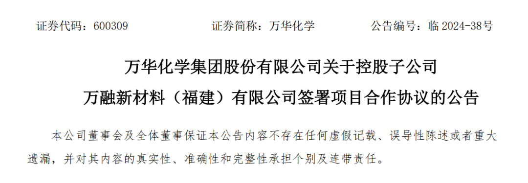 7月23日晚间,万华化学“发布公告,万华化学、子公司万融新材料(福建)有限公司(以下简称“万融新材料")与阿布扎比国家石油公司(ADNOC)及其关联公司北欧化工(Borealis)和博禄化学(Borouge)成功签署《项目合作协议》。