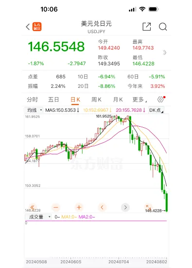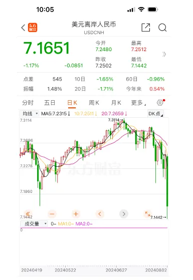 当地时间8月2日,美国非农就业指数弱于预期,美元指数大跌,非美货币全线上涨,离岸人民币对美元涨超1000个基点,升破7.15关口。