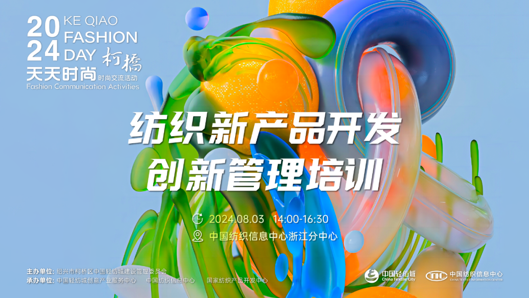 8月3日,由绍兴市柯桥区中国轻纺城建设管理委员会主办,中国轻纺城创意产业服务中心、中国纺织信息中心、国家纺织产品开发中心承办的2024柯桥天天时尚大师课堂——纺织新产品开发创新管理培训于绍兴柯桥中国纺织信息中心浙江分中心举行。