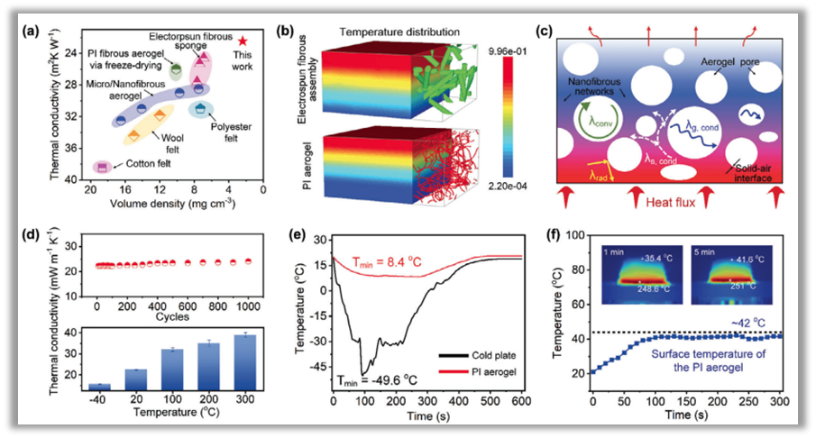 2、PI气凝胶具有超轻性能(密度为2.4 mg cm−3)、极端温度耐受性(在−196至300 °C范围内保持机械强度)和超低导热性能(22.4 mW m−1K−1),为在极端温度下保持人体热舒适性提供了理想材料。