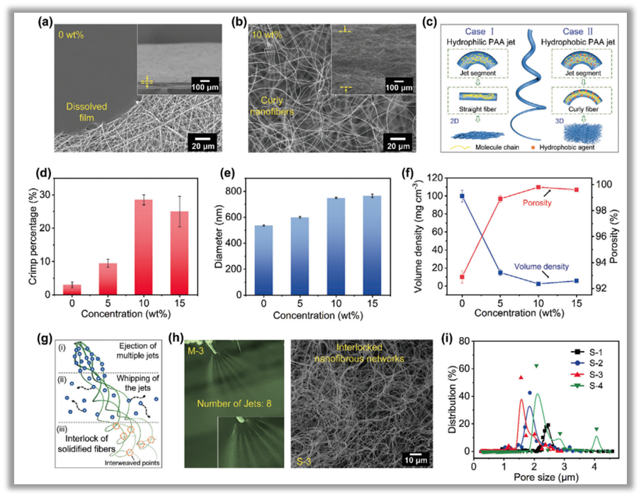 2纳米纤维的SEM图像,疏水剂浓度为(a0 wt%和(b10 wt%。(c)分别由亲水射流和疏水射流构建纳米纤维及其组装体的图示。(d-e)由PAA溶液与不同浓度疏水剂制备的PI卷曲纳米纤维的卷曲率和平均直径。(f)卷曲纳米纤维的体积密度和孔隙率。(g)互锁卷曲纳米纤维网络的形成过程图示。(h)多个射流的光学图像和纳米纤维气凝胶SEM图像。(i)不同电荷密度的溶液射流制备的纳米纤维气凝胶的孔径分布。