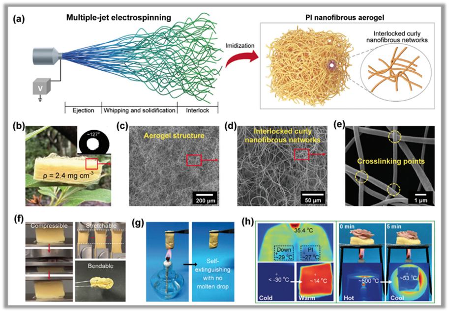 1a采用多射流弹射模式,直接将PI卷曲纳米纤维组装成互锁交联网络,形成了坚固的多孔气凝胶结构。