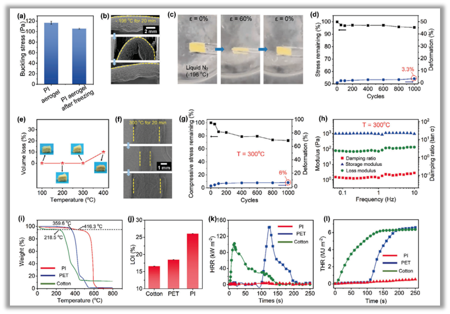a PI气凝胶在冷冻前后的屈曲σ。(b PI气凝胶冻结后的原位弯曲。(c 暴露于液氮的PI气凝胶的压缩和释放过程。(d PI气凝胶在冷冻20 min1000次循环中的剩余压缩σ和塑性变形。(e PI气凝胶在100℃200℃300℃400 ℃下的体积损失。(fPI气凝胶在300 ℃加热20 min后的原位压缩。(g PI气凝胶在300℃下循环1000次后的剩余压缩σ和塑性变形。(h PI气凝胶在300℃时的储能模量、损耗模量和阻尼比分别随频率的变化。(i 热重(TG)曲线,(j PI 气凝胶、PET 和棉花的 LOI 值、(k HRR 和(l THR