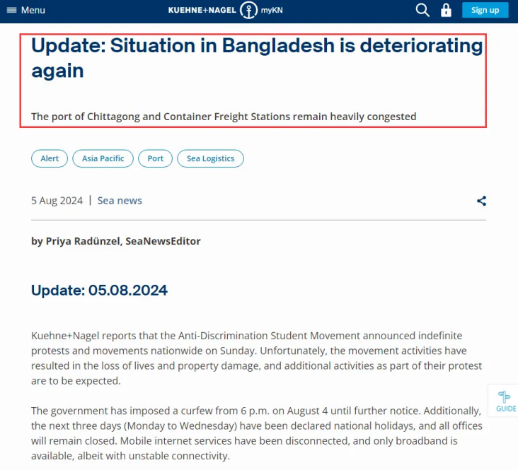 8月5日,德迅官网发布了预警:孟加拉国局势再次恶化,吉大港仍然严重拥堵。