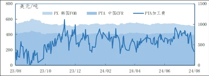 下游聚酯端原料补库意愿尚可,但近期有减产动作。由此现货压力凸显,PTA延续累库格局。至8月16日,PTA社会库存384.6万吨,周度环比增加7.3万吨,自七月份以来持续走高。PTA基差偏弱,加工费震荡走弱。