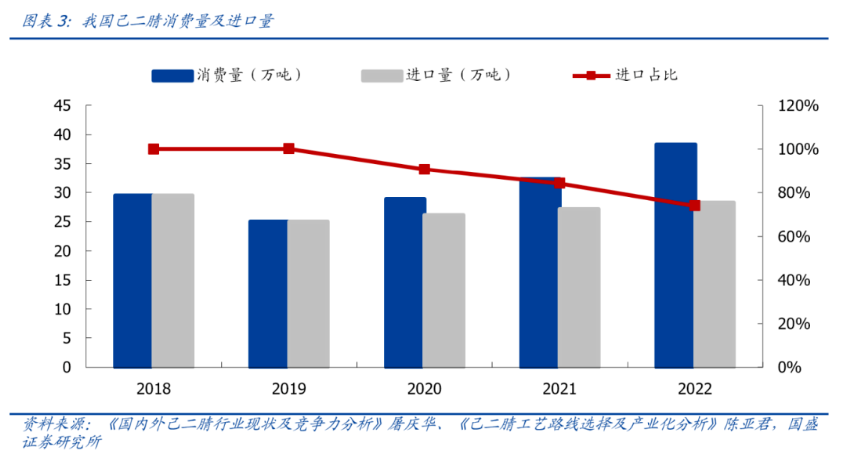 己二腈作为PA66核心上游中间体,生产技术长期由海外巨头垄断(2022年我国己二腈年消费量38万吨,进口占比74%)。近年来我国持续推动己二腈国产化突破,2019年中国化学公告投资100亿建设天辰齐翔尼龙66新材料基地,其中一期包含20万吨己二腈装置,为我国首个具备自主知识产权,采用丁二烯直接氢氰化法大规模量产己二腈的项目,技术路线具备较好经济性,成本大幅缩减。目前项目一期已经成功投产逐步提升负荷,突破海外技术垄断,有望加速国内尼龙66产业发展。