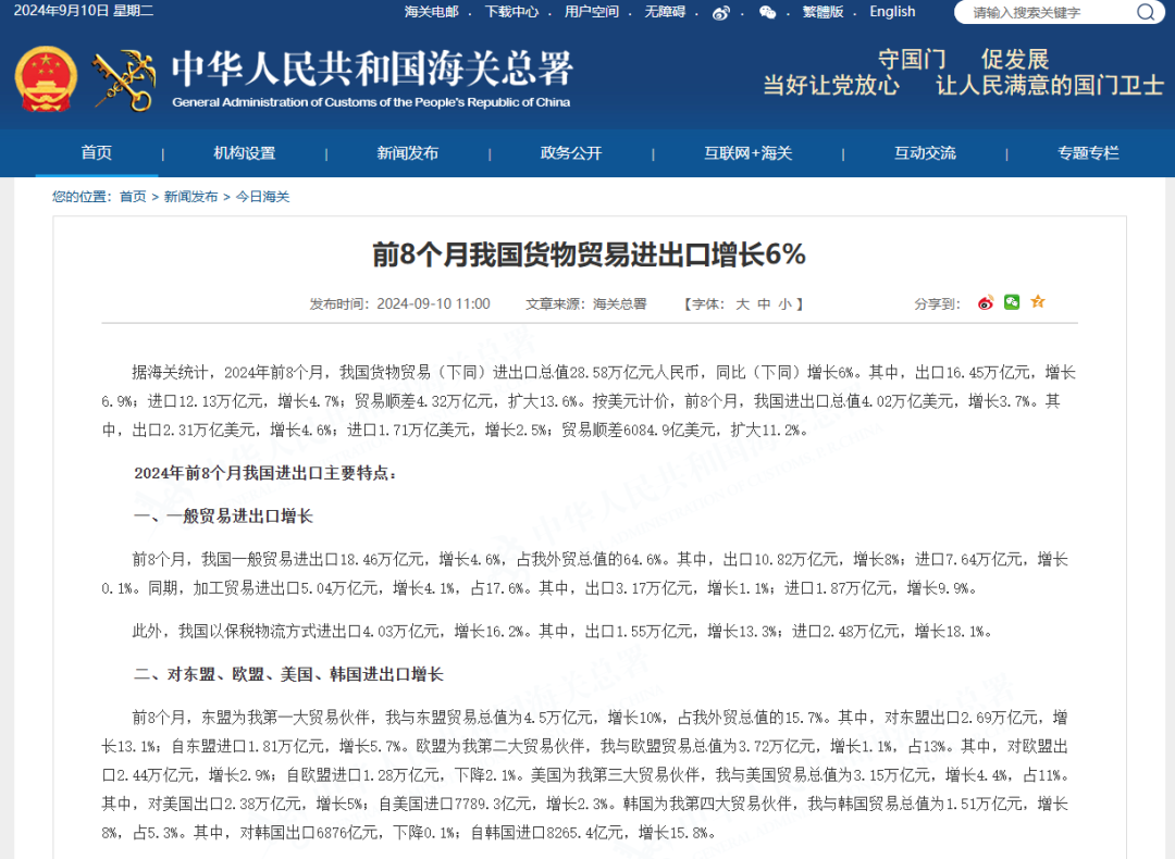 9月10日消息,据海关统计,2024年前8个月,我国货物贸易(下同)进出口总值28.58万亿元人民币,同比(下同)增长6%。其中,出口16.45万亿元,增长6.9%;进口12.13万亿元,增长4.7%;贸易顺差4.32万亿元,扩大13.6%。按美元计价,前8个月,我国进出口总值4.02万亿美元,增长3.7%。其中,出口2.31万亿美元,增长4.6%;进口1.71万亿美元,增长2.5%;贸易顺差6084.9亿美元,扩大11.2%。