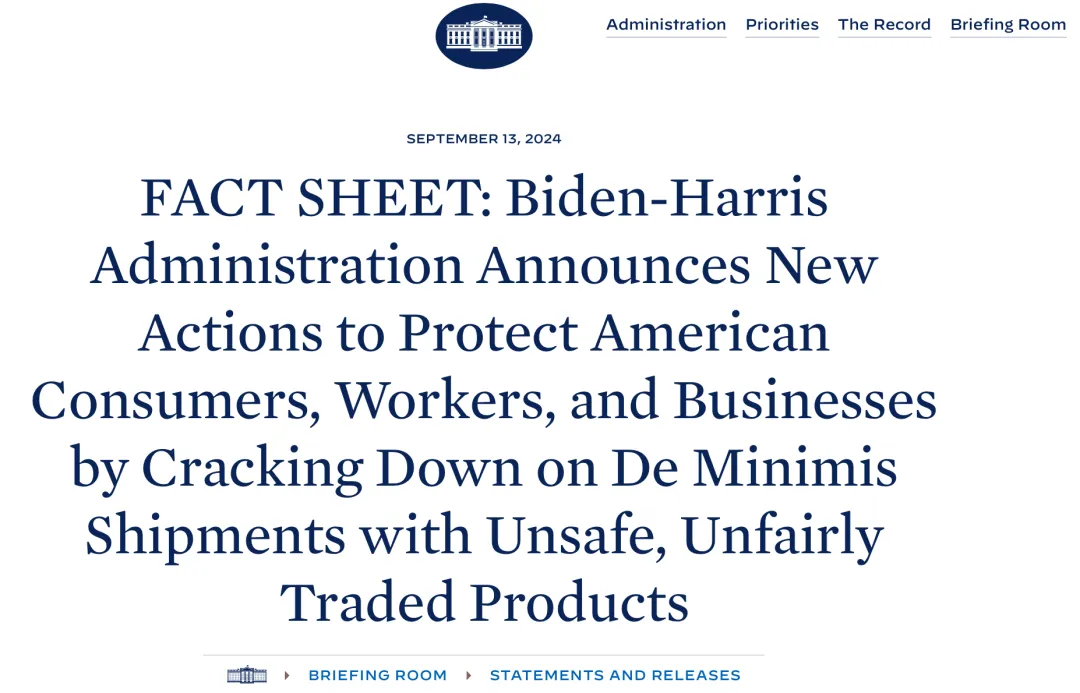 此外,白宫简报中特别提到,大多数要求享受最低限度豁免进入美国的货物来自几个中国电子商务平台,使美国消费者面临风险,削弱了美国工人和企业,并导致纺织品和服装等大量低价值产品免税进口到美国市场。