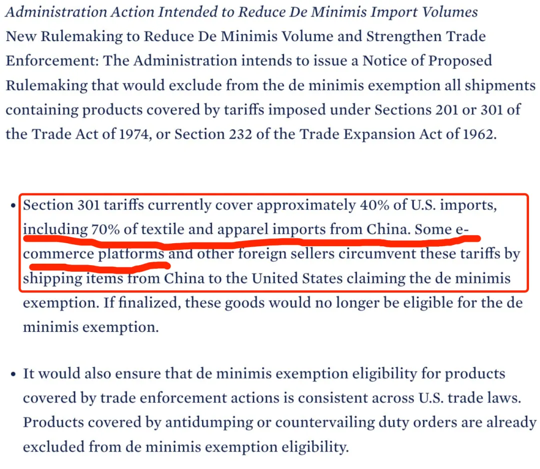 第301条关税目前覆盖了大约40%的美国进口,包括70%的来自中国的纺织品和服装进口。一些电子商务平台和其他外国卖家通过将商品从中国运往美国来规避这些关税,要求最低限度豁免。如果最终确定,这些商品将不再有资格享受最低限度的豁免。
