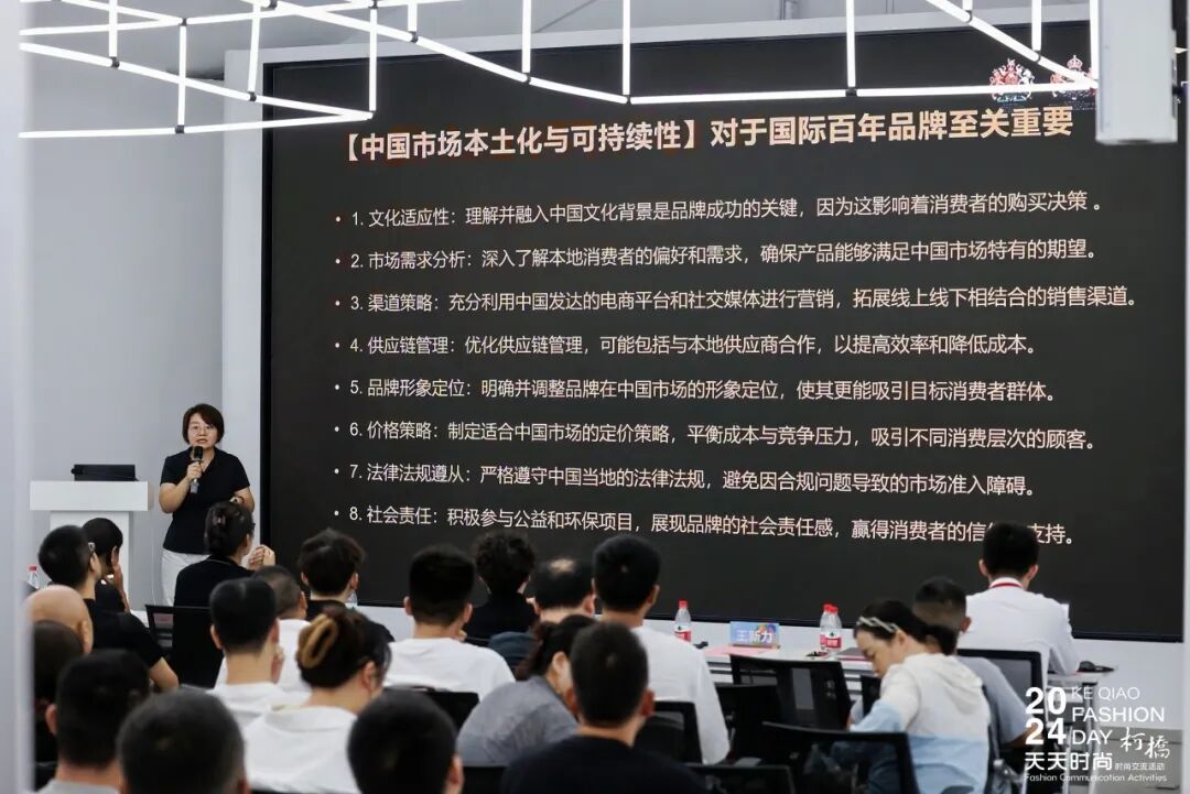 “理解并融入中国文化背景是品牌成功的关键,这影响着消费者的购买决策。”WOLSEY品牌研发设计负责人及商品企划负责人朱颖在《百年国际品牌中国市场本土化与可持续战略转型探讨》中表示,国际品牌在进入中国市场时,应从文化、市场、定位、法律等全方位考量本土化策略。她以FILA的本土化布局为例,讲解了品牌重塑、营销变革、设计本土化、零售转型的实用方案,并指出数字化转型、消费者行为变化、全球化与本地化,都是可持续时尚产业目前的聚焦点。