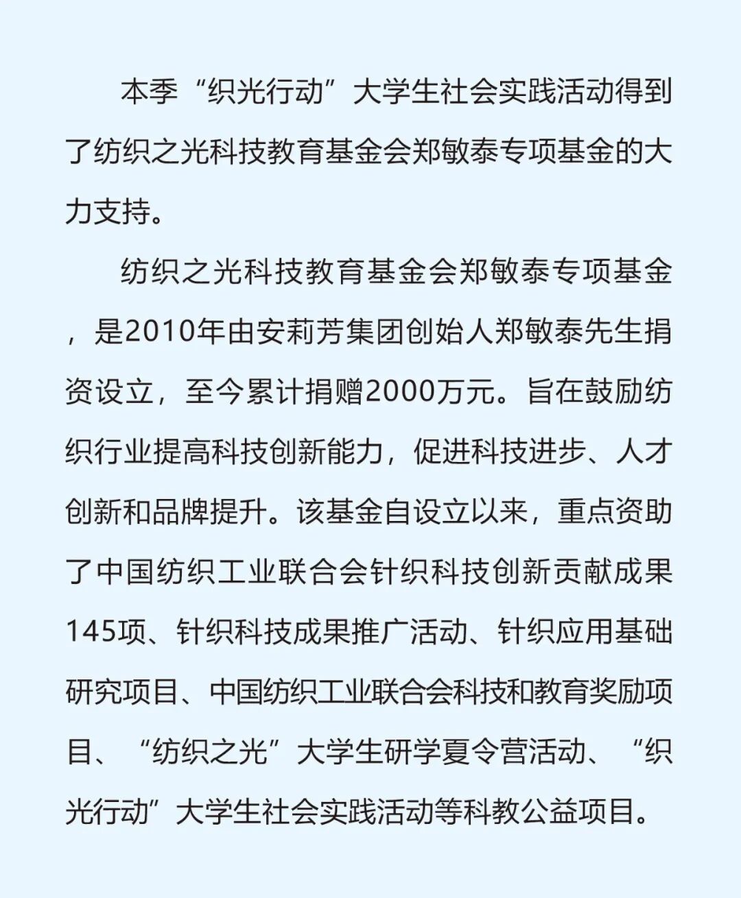 随着“暑期”到来,“织光行动”宛如星星之火,迅速燎原,点燃了公益的熊熊火焰,在全国各地引领了一系列鲜活而温馨的公益实践活动。随后,纺织之光科技教育基金会陆续接收到了一篇篇饱含情感与温度的公益实践报告。