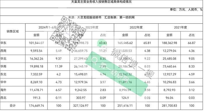第一纺织网注意到,报告期内,天富龙的销售区域集中于华东、华北和华南地区,各销售区域占比保持稳定。形成目前销售区域分布的主要原因为:(1)涤纶短纤维下游应用领域广泛,包括汽车内饰、家用纺织、铺地材料、建筑工程、鞋服材料、健康护理、过滤材料等行业。江苏、山东、浙江及广东区域具有经济发达、交通便利、便于出口等优势,下游产业集中度高,市场需求高于其他地区;(2)公司位于长三角经济圈,可充分利用区域优势开发江浙沪等周边地区客户,地理优势明显;(3)2024年1-6月,公司华南地区销售收入占比增加,主要由于公司积极开拓华南市场,通过建立子公司辐射珠三角经济圈,2023年“珠海项目”已经逐步投产。2023年和2024年1-6月,公司西南地区销售收入占比先上升后下降,主要由于2023年向东材科技销售的膜级聚酯切片较多,2024年1-6月向东材科技销售膜级聚酯切片减少。
