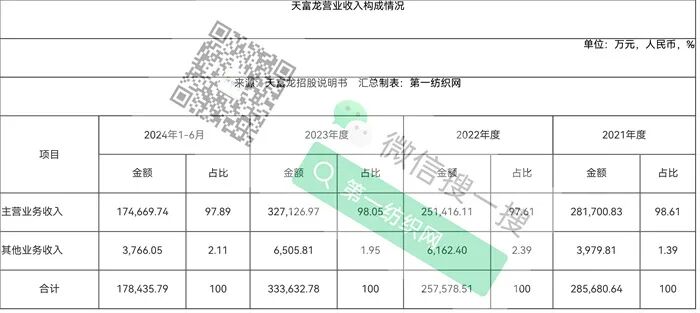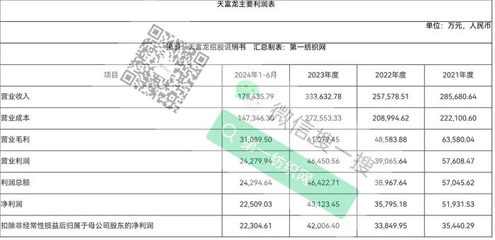 第一纺织网据招股说明书获悉,2021年度、2022年度、2023年度和2024年1-6月,天富龙的营业收入分别近28.57亿元、25.76亿元、33.36亿元和17.84亿元(注:上述数据已经第一纺织网四舍五入),归属于公司股东扣除非经常性损益后的净利润分别为3.54亿元、3.38亿元、4.20亿元和2.23亿元。
