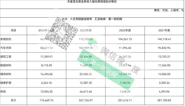 第一纺织网注意到,天富龙的产品下游终端应用领域广泛,覆盖了商务、出行、家居、健康护理、衣着等多个与居民生活、工作密切相关的场景。公司在汽车内饰领域,主要客户有中联地毯、拓普集团、坤泰股份、鸿祥股份、跃飞新材等;在家用纺织、建筑工程领域,主要客户有怡欣家居、佰家丽等;在健康护理领域,主要客户有北京大源等;在过滤材料领域,主要客户有亿茂环境、利韬滤材等;在铺地材料领域,主要客户有合力地毯等。