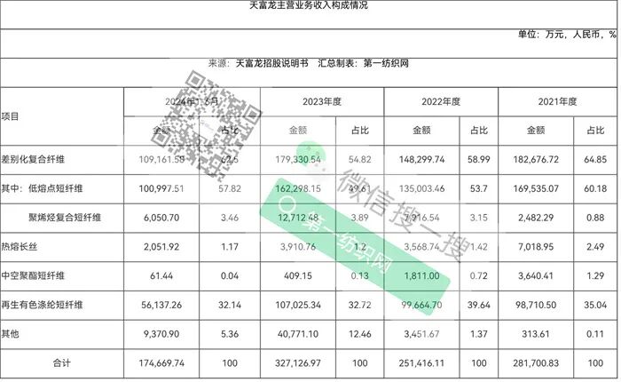 第一纺织网注意到,报告期内,天富龙的再生有色涤纶短纤维主要应用于汽车内饰领域,其市场销量排名蝉联行业第一。在家用纺织、建筑工程、健康护理等应用领域,公司差别化复合纤维满足粘合、柔软、亲水等功能性需求,并且兼具绿色环保的特点。因差别化复合纤维作为特定功能性材料,种类丰富,且细分应用范围广泛,尚无相关行业协会及专业机构统计各细分领域销售排名数据。