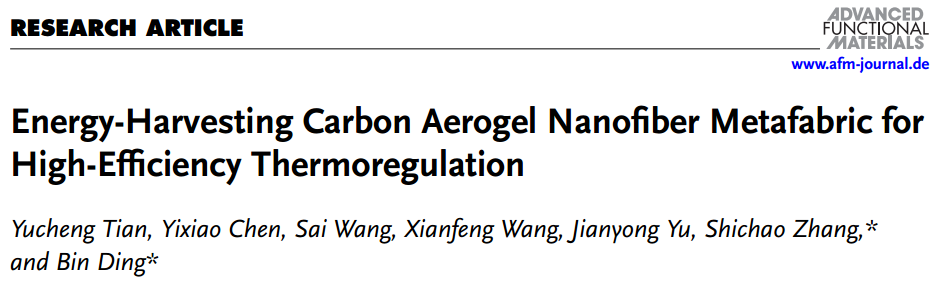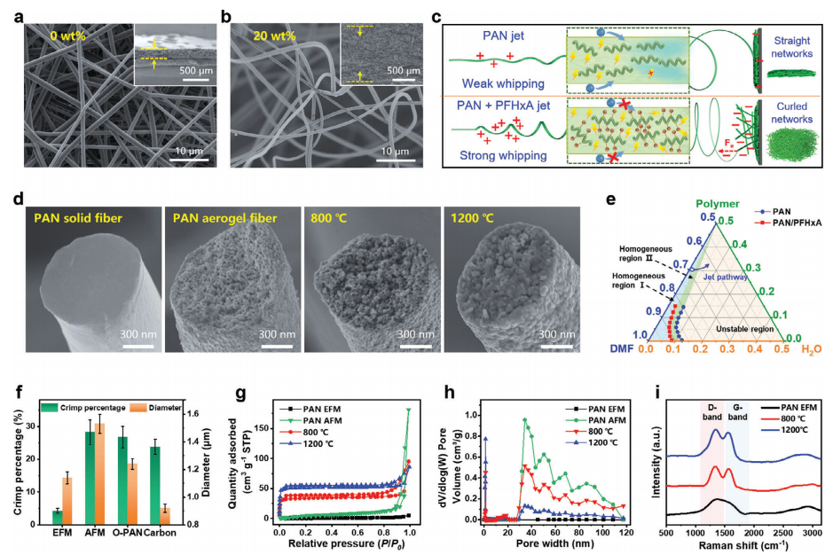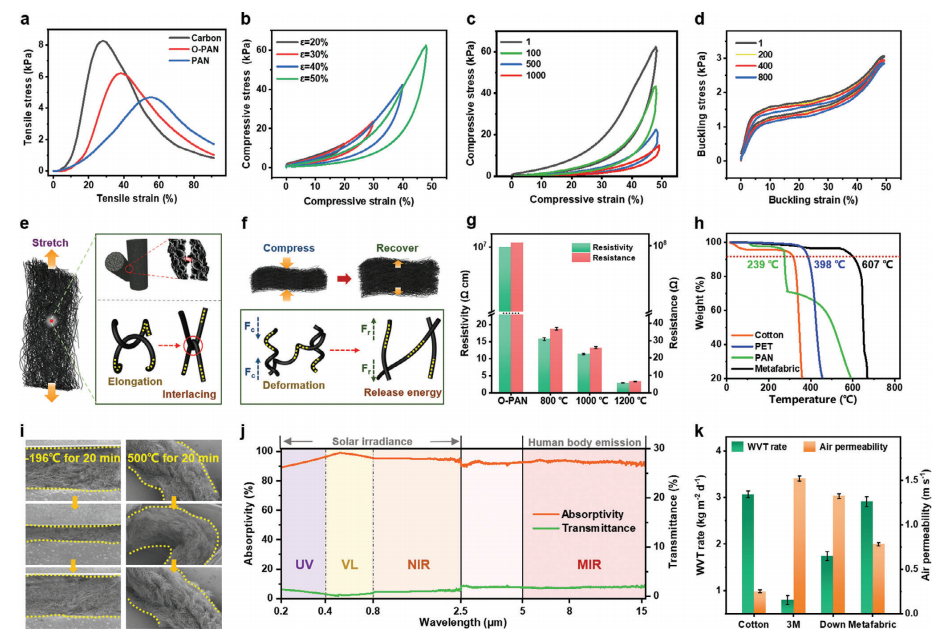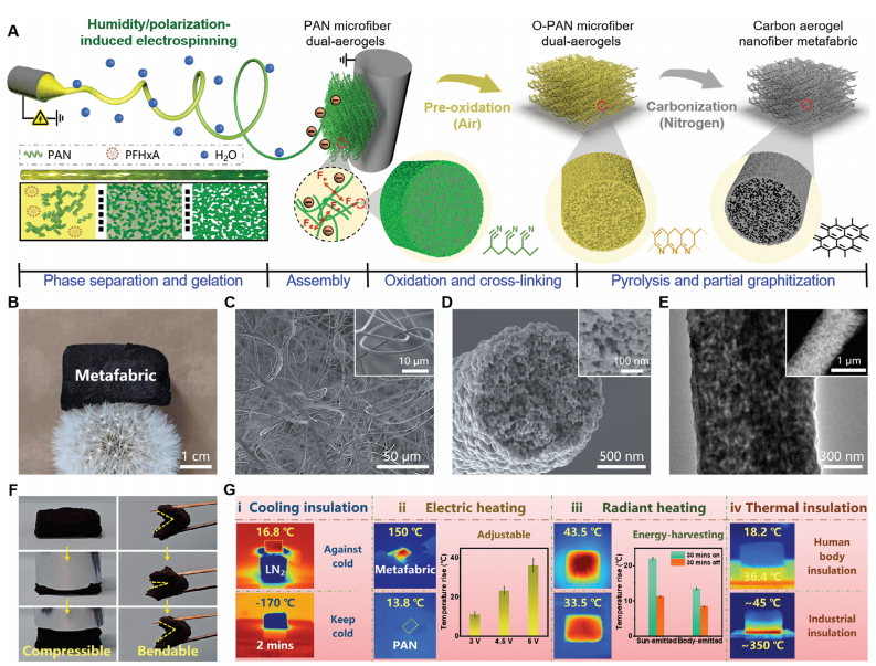 近日,东华大学丁彬、张世超团队针对开发将体温保持在安全舒适的范围的温度调节材料在多变的环境和极端的应用场景中面临的挑战取得最新进展。本文提出了一种独特的双气凝胶策略,用于合成碳气凝胶纳米纤维超织物的能量收集和温度调节。通过控制聚丙烯腈/水的相互作用和溶液的电荷密度,促进了静电纺射流中的相分离和库仑排斥,形成卷曲的纳米纤维,其内部纳米孔(尺寸为30-60 nm)相互缠绕形成纳米纤维双气凝胶结构;通过预氧化和优化石墨化制备了碳气凝胶纳米纤维超织物。由此产生的超织物具有高弹性,-196至600°C的耐温性,优异的隔热性能,高效的电热性能(15至150°C可调)和光热性能(辐射温度升高22°C)。这项工作为开发用于热管理的先进碳纳米材料提供了丰富的可能性。研究成果以“Energy-Harvesting Carbon Aerogel Nanofiber Metafabric for High-Efficiency Thermoregulation” 为题发表在《Advanced Functional Materials》。