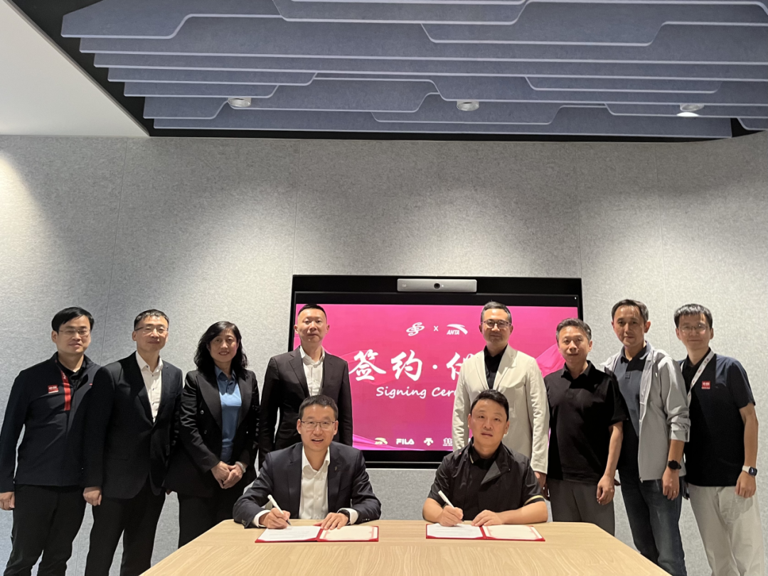 盛虹化纤新材料总经理唐俊松、营销副总经理钱敏、国家先进功能纤维创新中心董事长梅锋、中心主任王玉萍等;安踏集团COO陈科、安踏集团质量和科创副总裁李苏、安踏集团科研创新部创研管理高级总监王欣等领导出席并见证签约仪式。