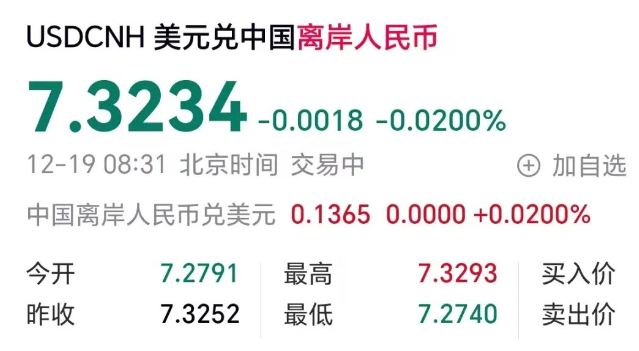 离岸人民币汇率连续跌破7.30、7.31、7.32关口,最低跌至7.3293元,创2023年以来最低。