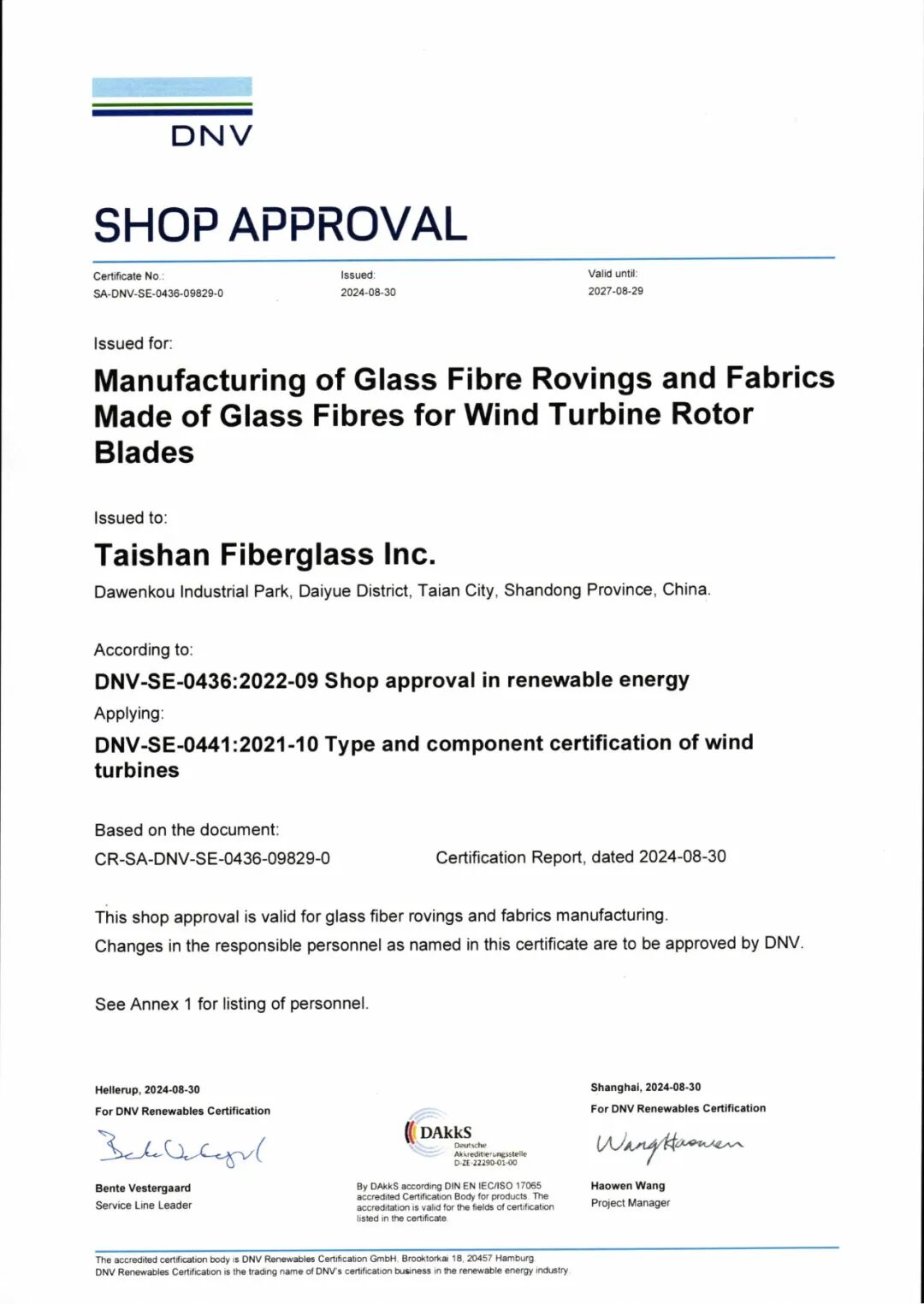 2024年9月,泰山玻纤获颁DNV全球首张玻纤纱线及织物工厂许可证 ,公司成为全球首个通过“产品、实验室和工厂”三类DNV认证的玻纤企业。