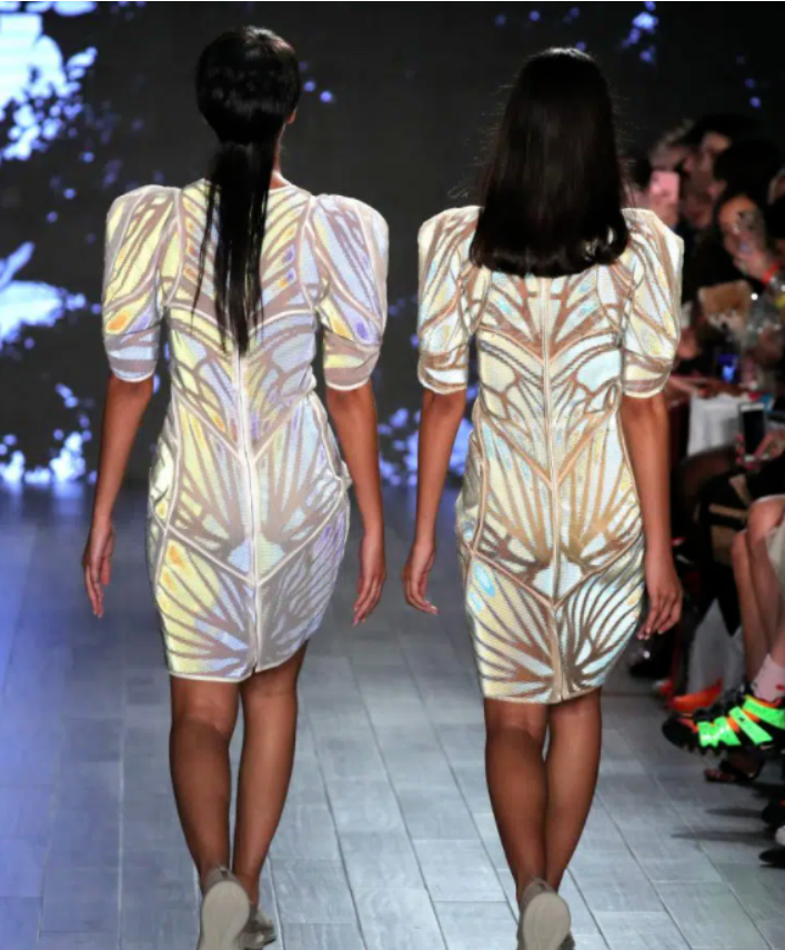 Chro-Morpho 系列风靡纽约时装周秀场。该系列的灵感来自蝴蝶和昆虫翅膀的光线过滤所产生的彩虹色和微观颜色,采用直接在织物上进行 3D 打印的新技术创作而成。连衣裙采用 Stratasys 设计的透镜效果制成。这种效果本身是通过将由光敏聚合物制成的鱼鳞大小的球形细胞直接 3D 打印到聚酯织物上而产生的。每个 3D 打印的电池都由一个内部有彩色条带的透明透镜组成。结果是一件由 27 个部件和数千个 3D 打印单元组成的裙子,每一个动作都会改变颜色。
