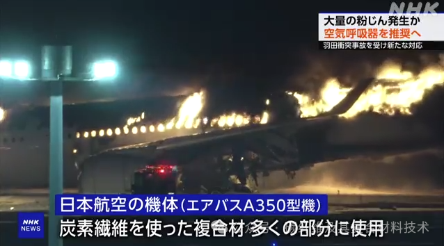 根据12月21日NHK News发布的最新视频文章《羽田空港事故受け 空港で活動の消防 空気呼吸器の装着推奨へ》介绍,受今年1月羽田机场发生的飞机相撞事故的影响,在机场工作的消防人员将采取新措施。由于燃烧的新型机体使用了大量碳纤维,很可能会产生大量粉尘,因此日本国土交通省计划在消防的内部规定中加入了安装空气呼吸器的推荐方案