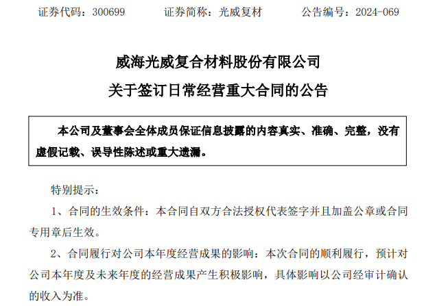 公告指出,合同涵盖了A、B、C、D、E五个型号的碳纤维及碳纤维织物,预计将对公司本年度及未来年度的经营成果产生积极影响。光威复材凭借其强大的研发实力和科技创新,已准备好迎接这一挑战,确保合同的顺利履行。