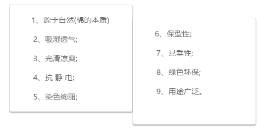冰丝其他成份的含量为微量,棉纤维成份的含量达1.14%.在几种主流纤维中。冰丝的含湿率最符合人体皮肤的生理要求,具有光滑凉爽、透气、抗静电、色彩绚丽等特点。