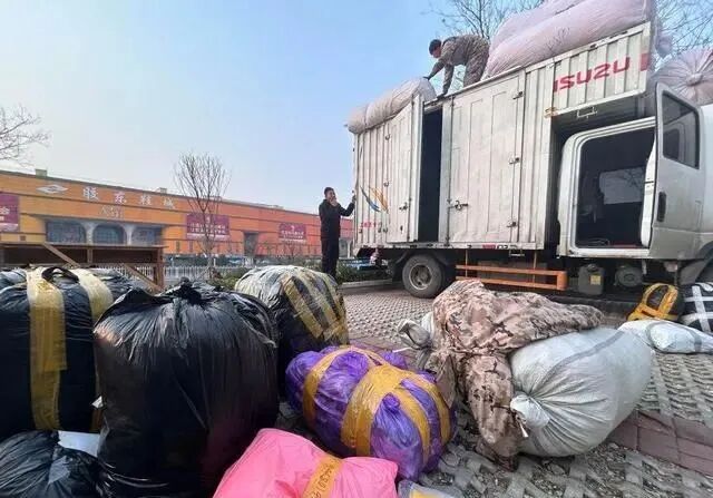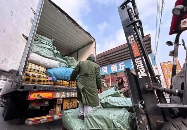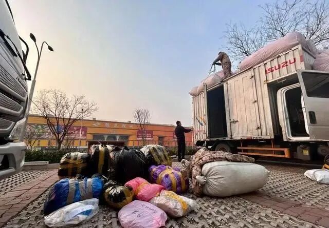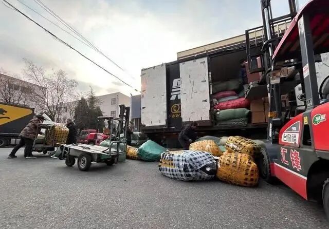 一辆来自河南郑州的物流车运来了产自当地加工厂的服装,五六名工作人员正在一名女老板的指挥下卸车。