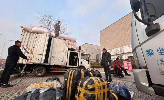 而在这辆大型物流车的另一侧,一辆挂有山西牌照的物流车面前,3名物流人员正用叉车装车。