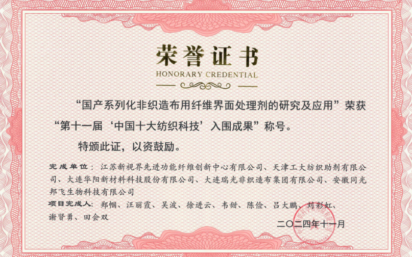 2024年创新中心还组建了高性能纤维界面处理技术郑帼教授科技工匠工作室,一年来,科技工匠工作室针对高性能纤维、生物基纤维、功能纤维等界面处理技术开展自主创新,对标进口产品,攻克耐热、耐黄变、抗静电、复材界面结合强度等关键技术问题,质效卓越。如,开展了系列化非织造布用纤维界面处理剂研究及应用合作,实现市场销售;开展了芳纶、超高分子量聚乙烯纺丝油剂及上浆剂、分散剂研究开发,开发出低成本国产纺丝油剂及定制专用油剂,可实现国产替代;形成了界面处理剂产学研用一体化的开发模式,制定行业产品标准体系,建立界面处理剂评价体系。