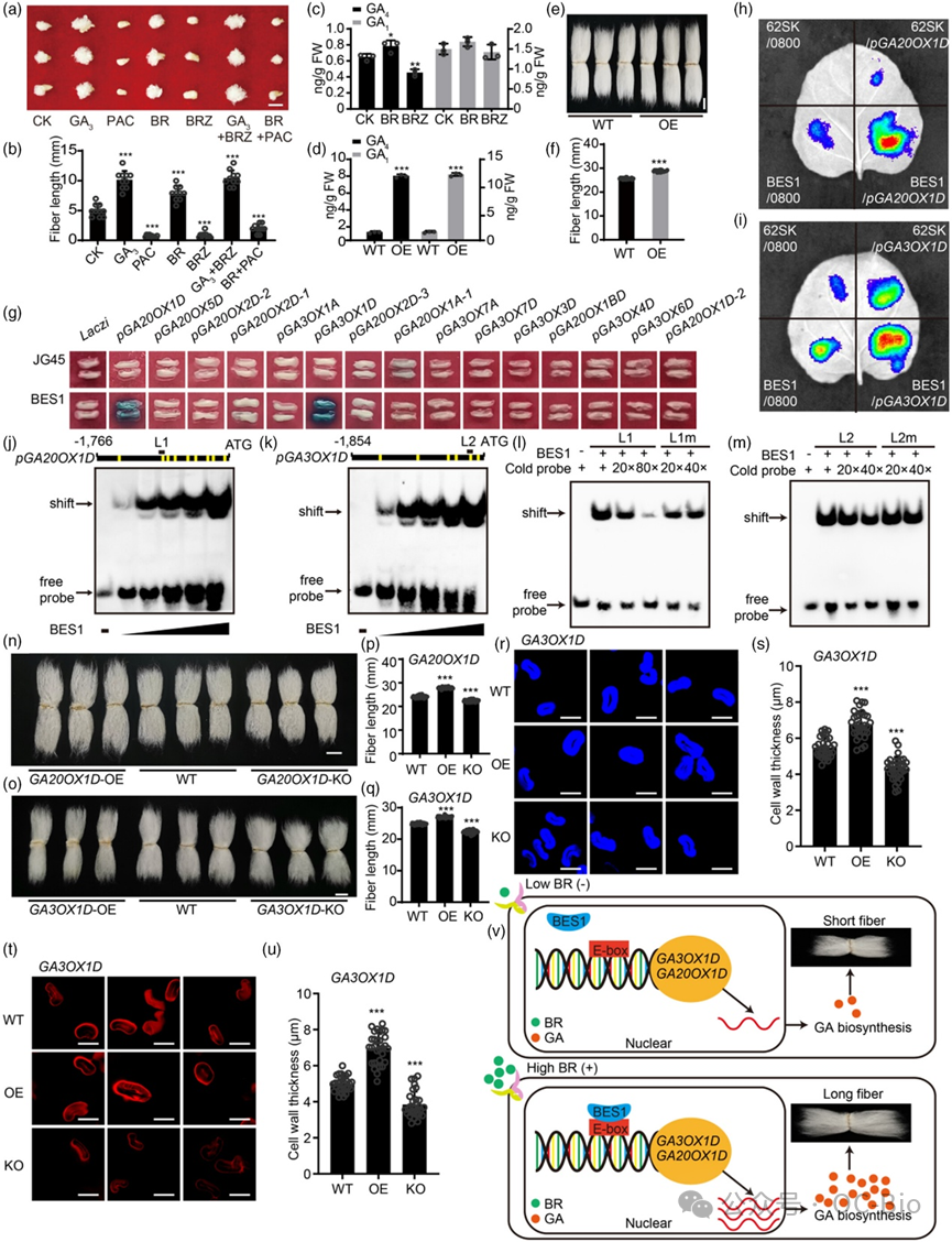该研究通过在棉花中创制BES1GA20OX1DGA3OX1D转基因株系,发现BR信号转录因子BES1转录激活GA合成基因GA20OX1DGA3OX1D的转录,从而调节GA生物合成以促进纤维发育。