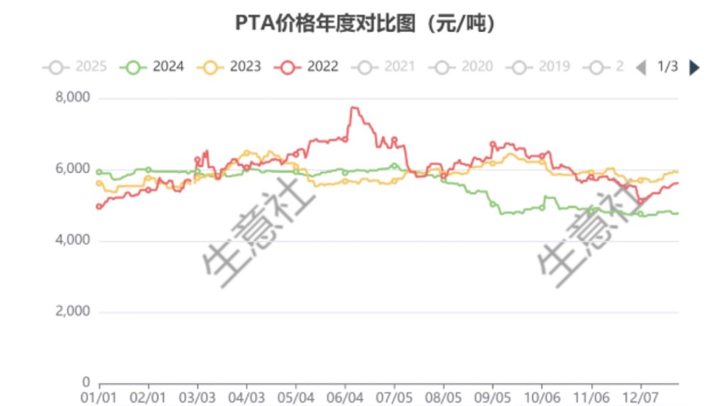 从与2023年对比来看,上半年PTA价格走势基本一致,下半年出现明显的分化,2024年大幅走跌,截止年末处于近三年的低位。