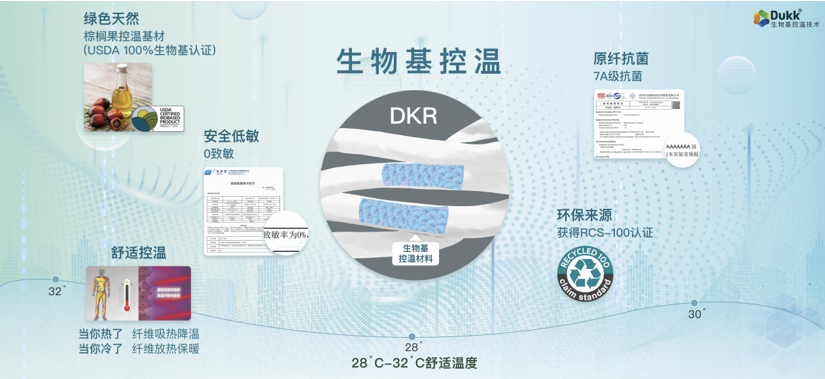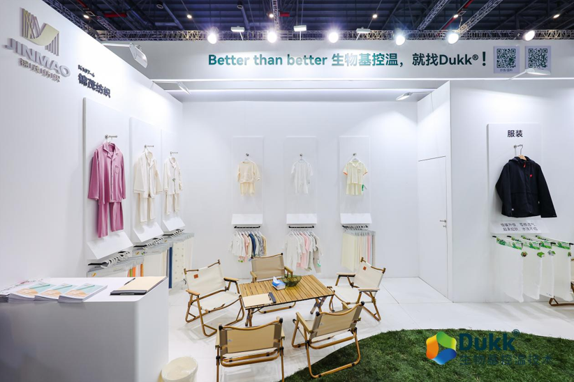 Dukk®作为生物基控温技术的领军企业,在本次展会中以“生物基控温技术联展”为主题,展示了其在控温纤维、控温絮片、控温纱线、控温面料及成品应用等领域的全产业链布局。