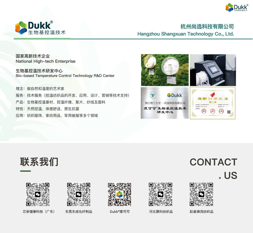 Dukk®在生物基控温技术领域的创新成果展示,以及通过与上下游企业的紧密合作呈现的完整生物基控温技术生态链,都让人印象深刻。未来,Dukk®将继续致力于推动控温纺织品的产业化发展,为全球消费者提供更环保、更健康的品质生活。