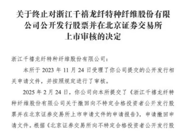 2025年3月19日,北交所发布了关于终止对浙江千禧龙纤特种纤维股份有限公司(简称:千禧龙纤)公开发行股票并在北京证券交易所上市审核的决定。这家成立于2010年2月、位于浙江金华的化纤企业,其IPO之路戛然而止。千禧龙纤是一家聚乙烯纤维产品研发商,2024年获国家级重点“小巨人”称号,员工数量达到581人,产品涵盖特种纤维、防弹产品、医用缝合线等,应用于国防军需装备、航空航天、防护用品等多个领域。