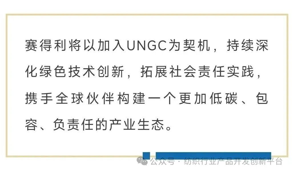 近期,赛得利集团(纺织行业再生纤维素纤维协同创新中心)已正式加入联合国全球契约组织(United Nations Global Compact,简称UNGC),意味着其在可持续发展、企业社会责任(CSR)和全球合作方面迈出了重要一步。
