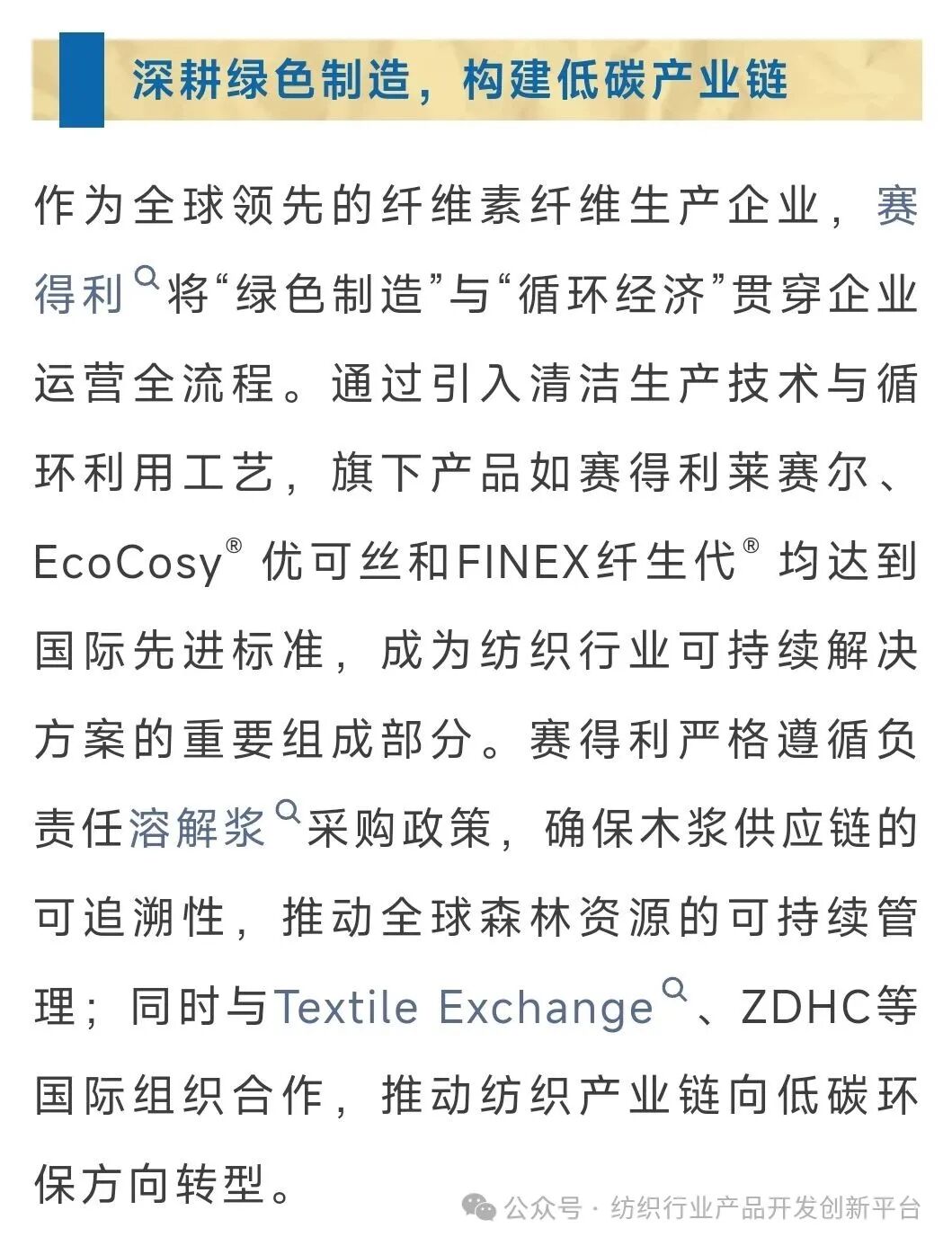 这一举措不仅体现了赛得利对全球可持续发展目标的承诺,也将更加深入地融入全球可持续发展的框架,通过透明化、规范化的企业责任实践,推动纺织行业的绿色转型,并为全球可持续发展目标的实现贡献力量。符合集团“保护环境,为客户创造价值,实现利民、利国、利业”的经营理念,展示了其在全球责任治理中的积极角色。