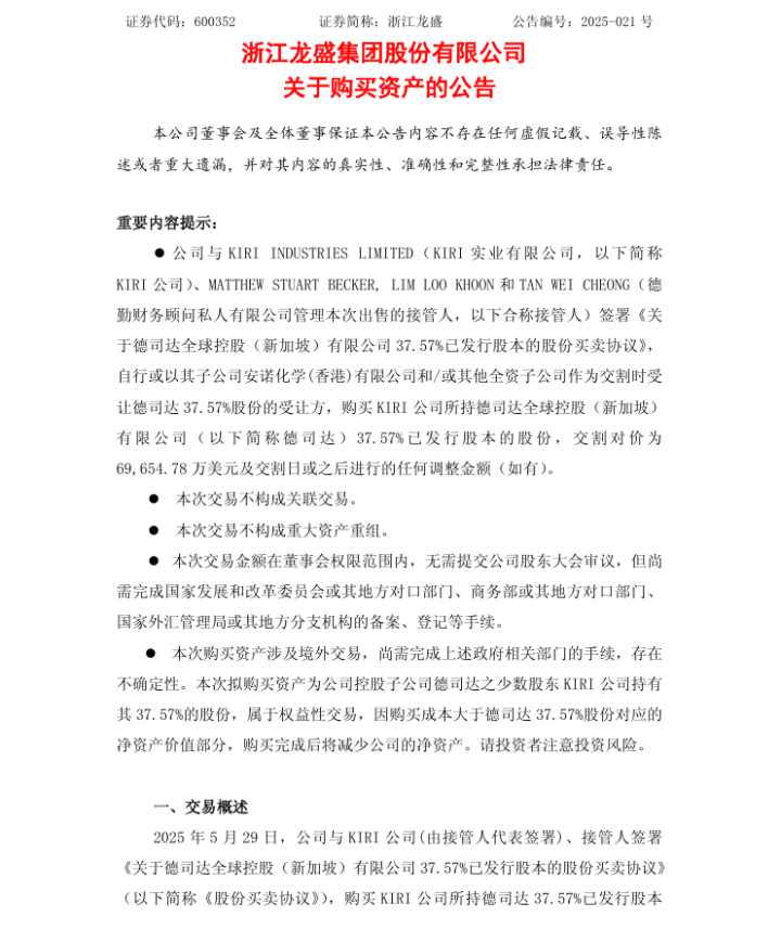5月30日,浙江龙盛(600352.SH)公告称,公司与KIRI公司、接管人签署股份买卖协议,购买KIRI公司所持德司达全球控股(新加坡)有限公司37.57%已发行股本的股份。