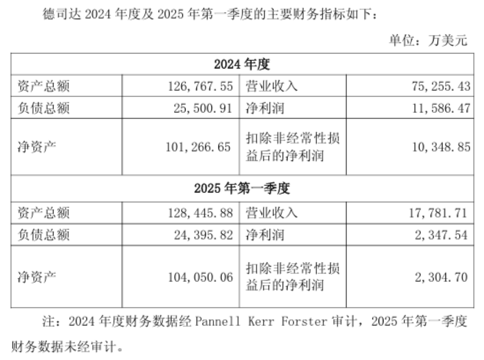 另外,德司达2024年净利润高达1.16亿美元(扣非1.03亿美元),2025年Q1业绩扣非净利润2304.7美元,由此可预测年化可达约9218.8万美元。